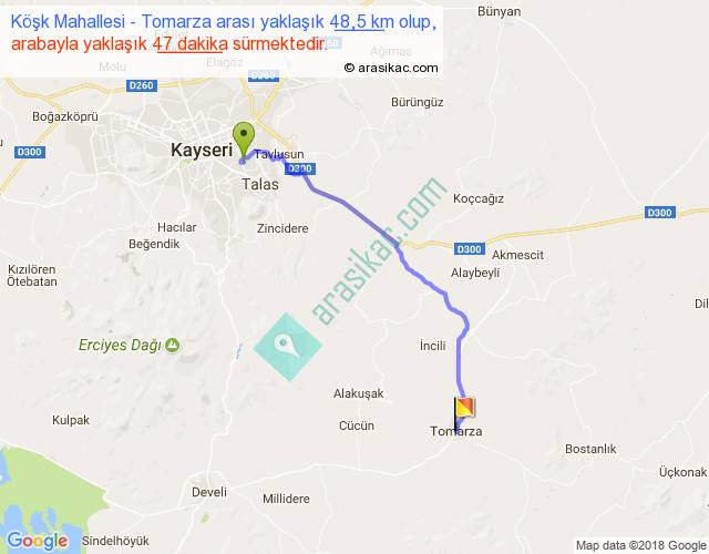 Köşk Mahallesi - Tomarza arası yaklaşık olarak 90 km/h ile yukarıda belirtilen sürede olup, iki yerin kuş uçuşu uzaklığı (mesafesi) 37'dir. Yolculuk otobüsle 1 saat 1 dakika sürmektedir.