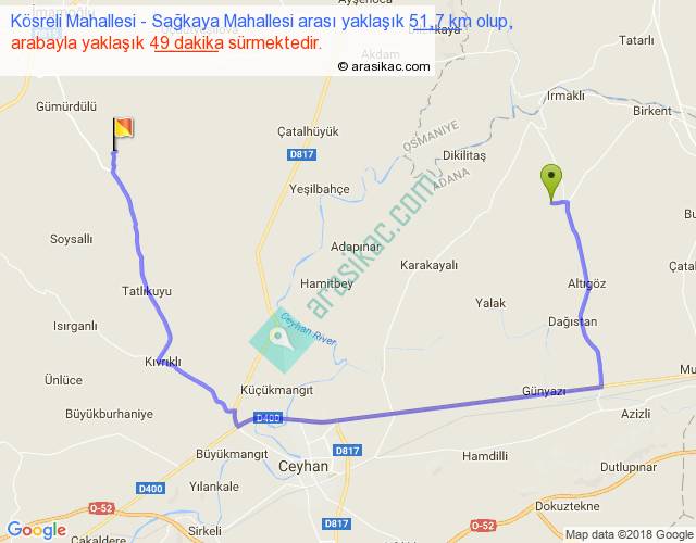 Kösreli Mahallesi - Sağkaya Mahallesi arası yaklaşık olarak 90 km/h ile yukarıda belirtilen sürede olup, iki yerin kuş uçuşu uzaklığı (mesafesi) 24'dir. Yolculuk otobüsle 1 saat 3 dakika sürmektedir.