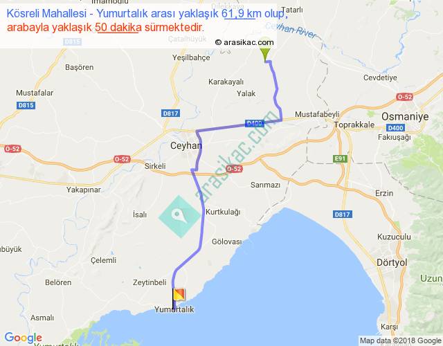 Kösreli Mahallesi - Yumurtalık arası yaklaşık olarak 90 km/h ile yukarıda belirtilen sürede olup, iki yerin kuş uçuşu uzaklığı (mesafesi) 46'dir. Yolculuk otobüsle 1 saat 5 dakika sürmektedir.