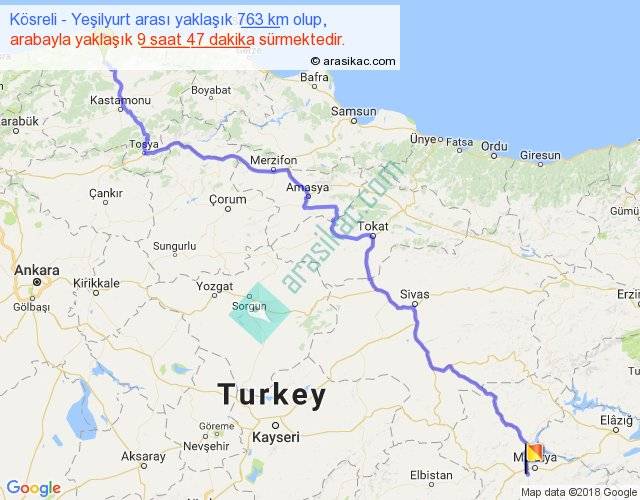 Kösreli - Yeşilyurt arası yaklaşık olarak 90 km/h ile yukarıda belirtilen sürede olup, iki yerin kuş uçuşu uzaklığı (mesafesi) 549'dir. Eğer belirtilen yerler arasında uçak seferi var ise bu süre uçakla 50 dakika'ya kadar düşebilir. Yolculuk otobüsle 12 saat 43 dakika sürmektedir.
