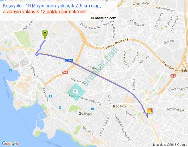 Koşuyolu - 19 Mayıs arası yaklaşık olarak 90 km/h ile yukarıda belirtilen sürede olup, iki yerin kuş uçuşu uzaklığı (mesafesi) 6'dir. Yolculuk otobüsle 15 dakika sürmektedir.