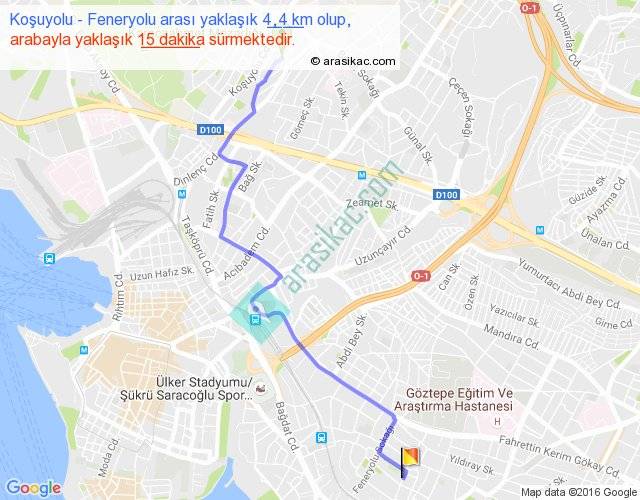 Koşuyolu - Feneryolu arası yaklaşık olarak 90 km/h ile yukarıda belirtilen sürede olup, iki yerin kuş uçuşu uzaklığı (mesafesi) 3'dir. Yolculuk otobüsle 19 dakika sürmektedir.