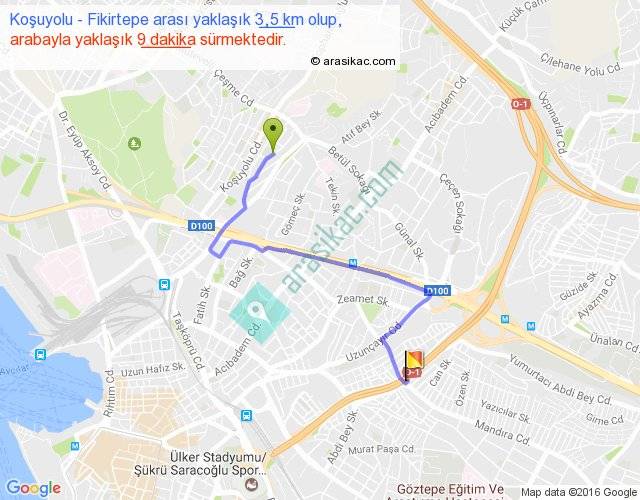 Koşuyolu - Fikirtepe arası yaklaşık olarak 90 km/h ile yukarıda belirtilen sürede olup, iki yerin kuş uçuşu uzaklığı (mesafesi) 2'dir. Yolculuk otobüsle 11 dakika sürmektedir.