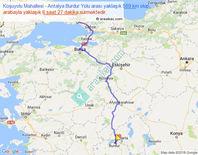 Koşuyolu Mahallesi - Antalya Burdur Yolu arası yaklaşık olarak 90 km/h ile yukarıda belirtilen sürede olup, iki yerin kuş uçuşu uzaklığı (mesafesi) 383'dir. Eğer belirtilen yerler arasında uçak seferi var ise bu süre uçakla 35 dakika'ya kadar düşebilir. Yolculuk otobüsle 8 saat 23 dakika sürmektedir.