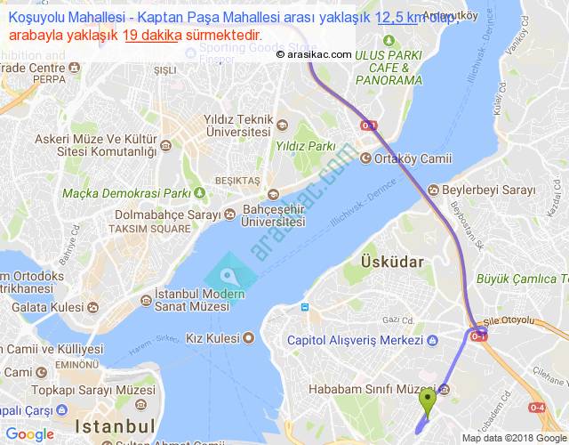 Koşuyolu Mahallesi - Kaptan Paşa Mahallesi arası yaklaşık olarak 90 km/h ile yukarıda belirtilen sürede olup, iki yerin kuş uçuşu uzaklığı (mesafesi) 8'dir. Yolculuk otobüsle 24 dakika sürmektedir.