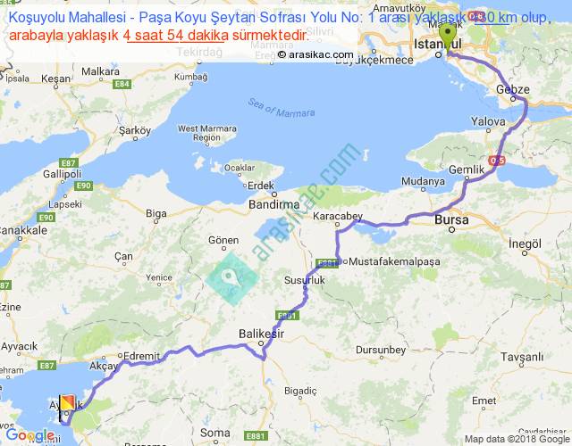 Koşuyolu Mahallesi - Paşa Koyu Şeytan Sofrası Yolu No: 1 arası yaklaşık olarak 90 km/h ile yukarıda belirtilen sürede olup, iki yerin kuş uçuşu uzaklığı (mesafesi) 277'dir. Eğer belirtilen yerler arasında uçak seferi var ise bu süre uçakla 25 dakika'ya kadar düşebilir. Yolculuk otobüsle 6 saat 22 dakika sürmektedir.