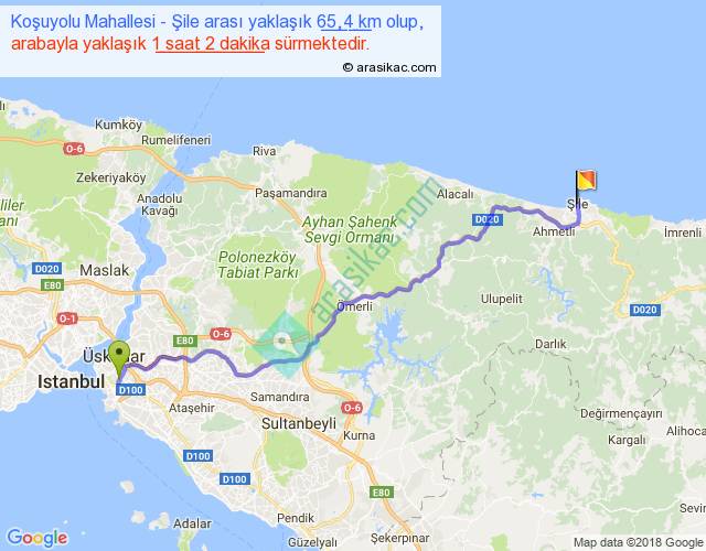Koşuyolu Mahallesi - Şile arası yaklaşık olarak 90 km/h ile yukarıda belirtilen sürede olup, iki yerin kuş uçuşu uzaklığı (mesafesi) 51'dir. Yolculuk otobüsle 1 saat 20 dakika sürmektedir.