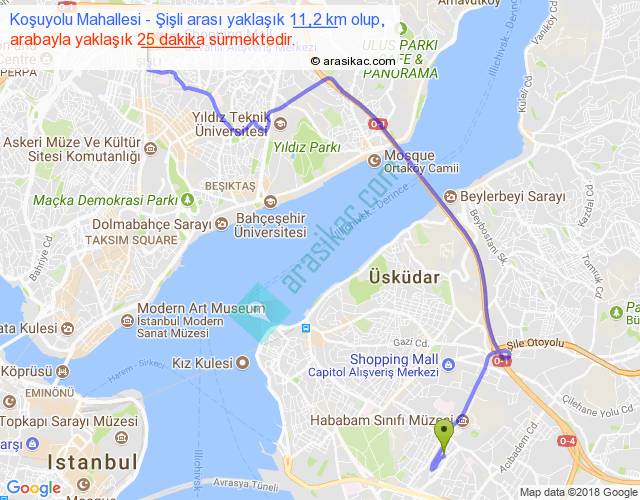 Koşuyolu Mahallesi - Şişli arası yaklaşık olarak 90 km/h ile yukarıda belirtilen sürede olup, iki yerin kuş uçuşu uzaklığı (mesafesi) 7'dir. Yolculuk otobüsle 32 dakika sürmektedir.