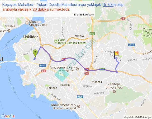 Eğer Koşuyolu Mahallesi Yukarı Dudullu Mahallesi arası ne kadar yakar (benzin/mazot) diyorsanız, kilometrede 3 ₺ yakan bir aracınız var ise 45, km'de 4 ₺ yakan bir aracınız var ise 60, km'de 5 ₺ yakan bir aracınız var ise 75 ile bu yolculuğu tamamlayabilirsiniz.