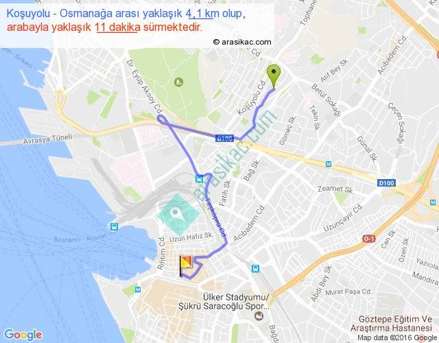 Koşuyolu - Osmanağa arası yaklaşık olarak 90 km/h ile yukarıda belirtilen sürede olup, iki yerin kuş uçuşu uzaklığı (mesafesi) 2'dir. Yolculuk otobüsle 14 dakika sürmektedir.