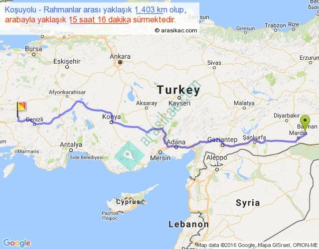 Koşuyolu - Rahmanlar arası yaklaşık olarak 90 km/h ile yukarıda belirtilen sürede olup, iki yerin kuş uçuşu uzaklığı (mesafesi) 1106'dir. Eğer belirtilen yerler arasında uçak seferi var ise bu süre uçakla 1 saat 42 dakika'ya kadar düşebilir. Yolculuk otobüsle 19 saat 50 dakika sürmektedir.
