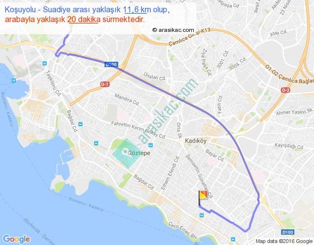 Koşuyolu - Suadiye arası yaklaşık olarak 90 km/h ile yukarıda belirtilen sürede olup, iki yerin kuş uçuşu uzaklığı (mesafesi) 6'dir. Yolculuk otobüsle 26 dakika sürmektedir.