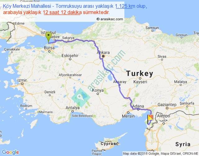 Köy Merkezi Mahallesi - Tomruksuyu arası yaklaşık olarak 90 km/h ile yukarıda belirtilen sürede olup, iki yerin kuş uçuşu uzaklığı (mesafesi) 785'dir. Eğer belirtilen yerler arasında uçak seferi var ise bu süre uçakla 1 saat 12 dakika'ya kadar düşebilir. Yolculuk otobüsle 15 saat 51 dakika sürmektedir.