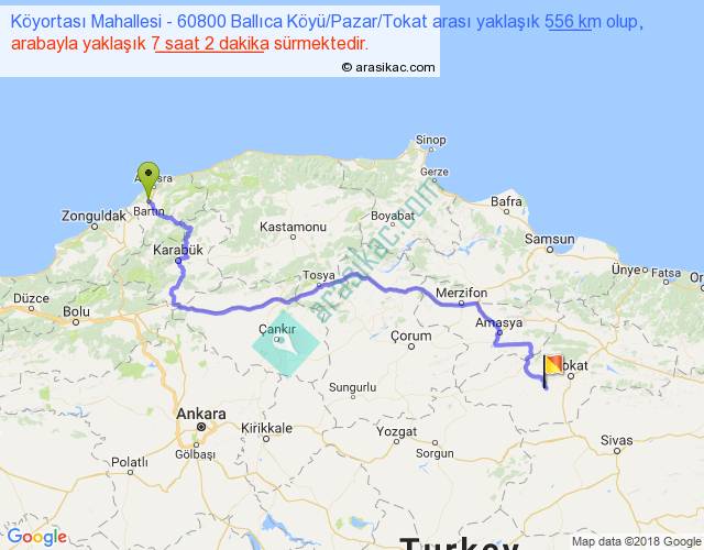 Köyortası Mahallesi - 60800 Ballıca Köyü Pazar Tokat arası yaklaşık olarak 90 km/h ile yukarıda belirtilen sürede olup, iki yerin kuş uçuşu uzaklığı (mesafesi) 366'dir. Eğer belirtilen yerler arasında uçak seferi var ise bu süre uçakla 33 dakika'ya kadar düşebilir. Yolculuk otobüsle 9 saat 8 dakika sürmektedir.