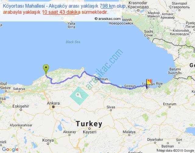 Köyortası Mahallesi - Akçaköy arası yaklaşık olarak 90 km/h ile yukarıda belirtilen sürede olup, iki yerin kuş uçuşu uzaklığı (mesafesi) 610'dir. Eğer belirtilen yerler arasında uçak seferi var ise bu süre uçakla 56 dakika'ya kadar düşebilir. Yolculuk otobüsle 13 saat 55 dakika sürmektedir.