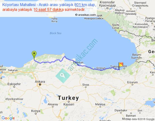 Köyortası Mahallesi - Araklı arası yaklaşık olarak 90 km/h ile yukarıda belirtilen sürede olup, iki yerin kuş uçuşu uzaklığı (mesafesi) 646'dir. Eğer belirtilen yerler arasında uçak seferi var ise bu süre uçakla 59 dakika'ya kadar düşebilir. Yolculuk otobüsle 14 saat 14 dakika sürmektedir.