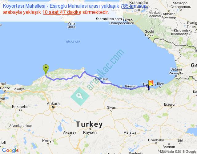 Köyortası Mahallesi - Esiroğlu Mahallesi arası yaklaşık olarak 90 km/h ile yukarıda belirtilen sürede olup, iki yerin kuş uçuşu uzaklığı (mesafesi) 616'dir. Eğer belirtilen yerler arasında uçak seferi var ise bu süre uçakla 56 dakika'ya kadar düşebilir. Yolculuk otobüsle 14 saat 1 dakika sürmektedir.