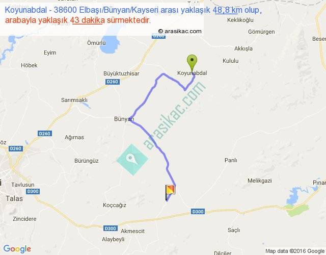 Koyunabdal - 38600 Elbaşı Bünyan Kayseri arası yaklaşık olarak 90 km/h ile yukarıda belirtilen sürede olup, iki yerin kuş uçuşu uzaklığı (mesafesi) 30'dir. Yolculuk otobüsle 55 dakika sürmektedir.
