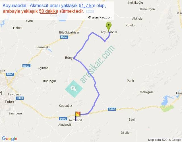 Koyunabdal - Akmescit arası yaklaşık olarak 90 km/h ile yukarıda belirtilen sürede olup, iki yerin kuş uçuşu uzaklığı (mesafesi) 39'dir. Yolculuk otobüsle 1 saat 16 dakika sürmektedir.