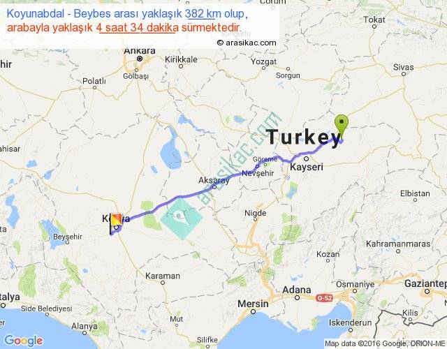 Koyunabdal - Beybes arası yaklaşık olarak 90 km/h ile yukarıda belirtilen sürede olup, iki yerin kuş uçuşu uzaklığı (mesafesi) 340'dir. Eğer belirtilen yerler arasında uçak seferi var ise bu süre uçakla 31 dakika'ya kadar düşebilir. Yolculuk otobüsle 5 saat 56 dakika sürmektedir.
