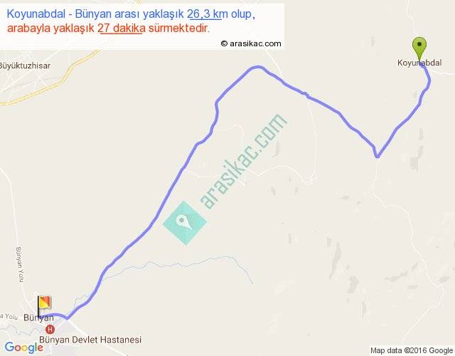 Koyunabdal - Bünyan arası yaklaşık olarak 90 km/h ile yukarıda belirtilen sürede olup, iki yerin kuş uçuşu uzaklığı (mesafesi) 19'dir. Yolculuk otobüsle 35 dakika sürmektedir.