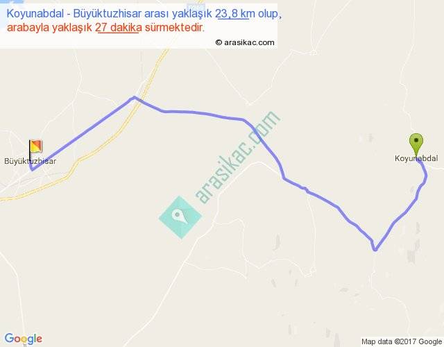 Koyunabdal - Büyüktuzhisar arası yaklaşık olarak 90 km/h ile yukarıda belirtilen sürede olup, iki yerin kuş uçuşu uzaklığı (mesafesi) 16'dir. Yolculuk otobüsle 35 dakika sürmektedir.