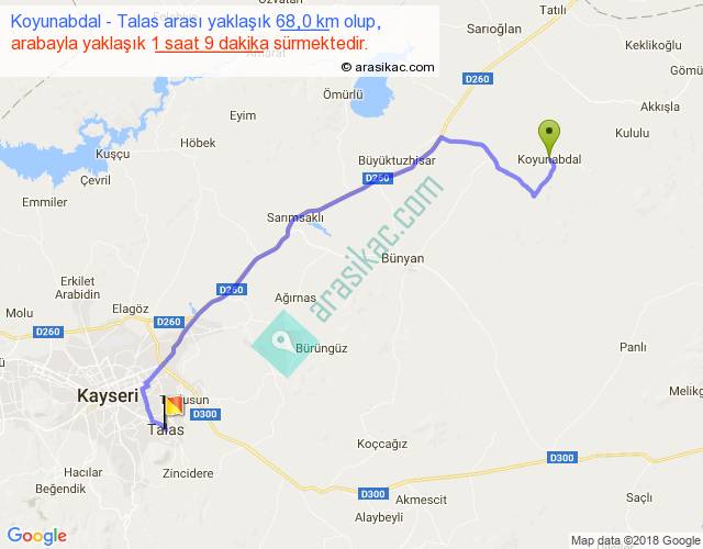 Koyunabdal - Talas arası yaklaşık olarak 90 km/h ile yukarıda belirtilen sürede olup, iki yerin kuş uçuşu uzaklığı (mesafesi) 51'dir. Yolculuk otobüsle 1 saat 29 dakika sürmektedir.