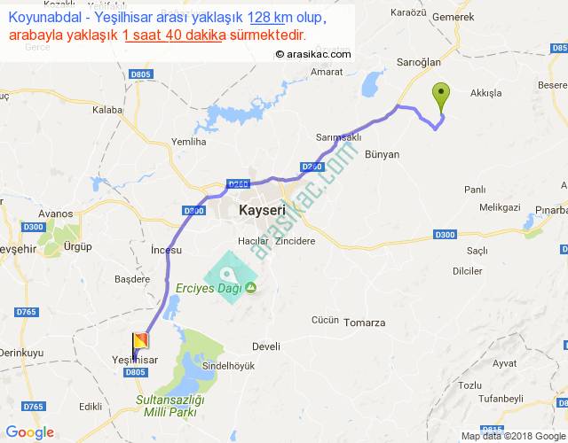 Koyunabdal - Yeşilhisar arası yaklaşık olarak 90 km/h ile yukarıda belirtilen sürede olup, iki yerin kuş uçuşu uzaklığı (mesafesi) 105'dir. Yolculuk otobüsle 2 saat 10 dakika sürmektedir.