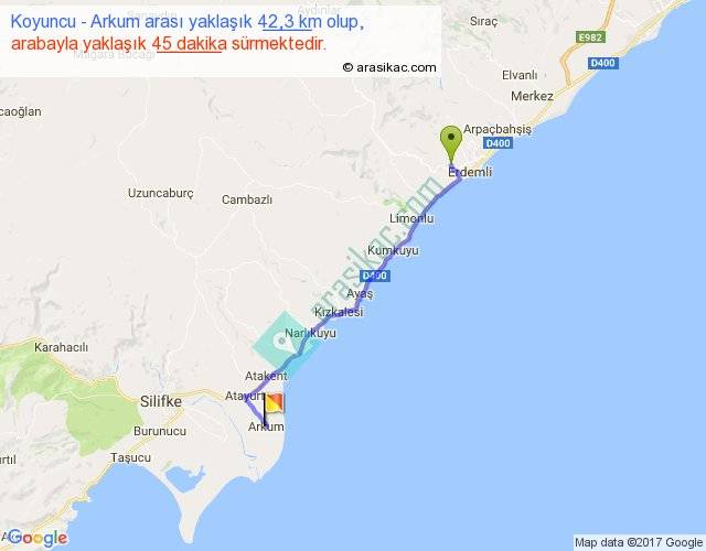 Koyuncu - Arkum arası yaklaşık olarak 90 km/h ile yukarıda belirtilen sürede olup, iki yerin kuş uçuşu uzaklığı (mesafesi) 35'dir. Yolculuk otobüsle 58 dakika sürmektedir.
