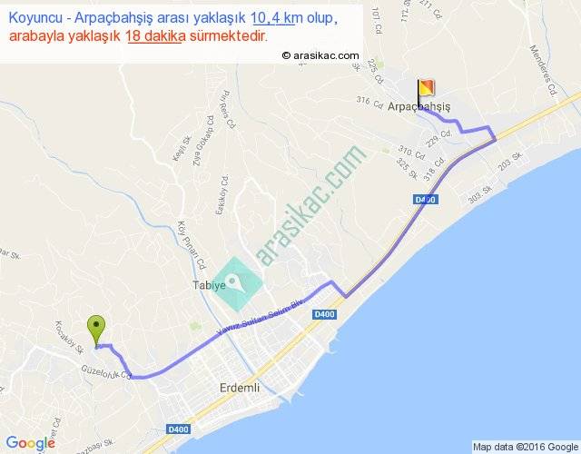 Koyuncu - Arpaçbahşiş arası yaklaşık olarak 90 km/h ile yukarıda belirtilen sürede olup, iki yerin kuş uçuşu uzaklığı (mesafesi) 7'dir. Yolculuk otobüsle 23 dakika sürmektedir.