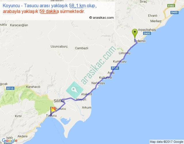 Koyuncu - Tasucu arası yaklaşık olarak 90 km/h ile yukarıda belirtilen sürede olup, iki yerin kuş uçuşu uzaklığı (mesafesi) 48'dir. Yolculuk otobüsle 1 saat 16 dakika sürmektedir.