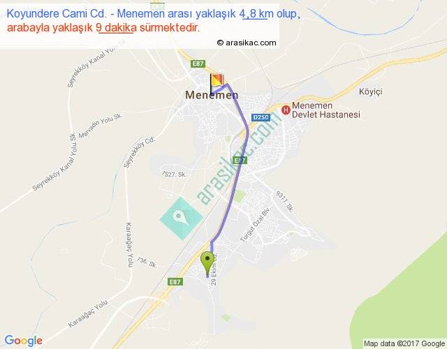 Koyundere Cami Cd. - Menemen arası yaklaşık olarak 90 km/h ile yukarıda belirtilen sürede olup, iki yerin kuş uçuşu uzaklığı (mesafesi) 4'dir. Yolculuk otobüsle 11 dakika sürmektedir.