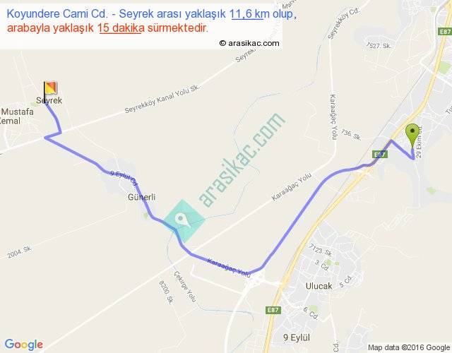 Koyundere Cami Cd. - Seyrek arası yaklaşık olarak 90 km/h ile yukarıda belirtilen sürede olup, iki yerin kuş uçuşu uzaklığı (mesafesi) 8'dir. Yolculuk otobüsle 19 dakika sürmektedir.