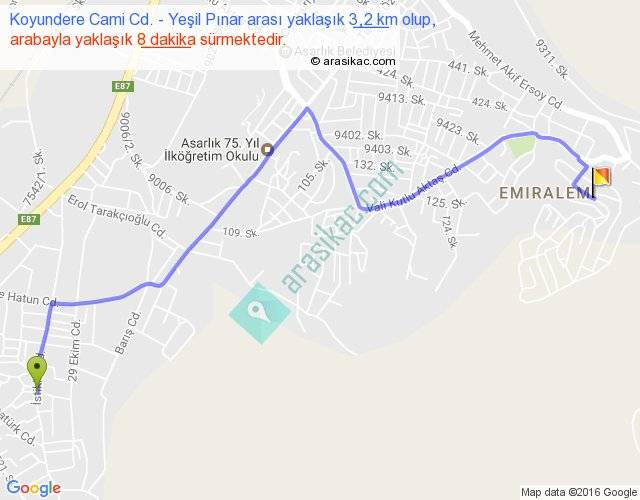 Koyundere Cami Cd. - Yeşil Pınar arası yaklaşık olarak 90 km/h ile yukarıda belirtilen sürede olup, iki yerin kuş uçuşu uzaklığı (mesafesi) 2'dir. Yolculuk otobüsle 10 dakika sürmektedir.