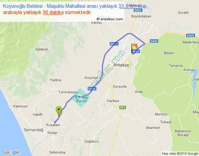Koyunoğlu Beldesi - Maşuklu Mahallesi arası yaklaşık olarak 90 km/h ile yukarıda belirtilen sürede olup, iki yerin kuş uçuşu uzaklığı (mesafesi) 19'dir. Yolculuk otobüsle 46 dakika sürmektedir.