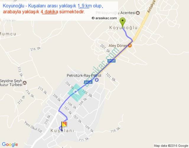 Koyunoğlu - Kuşalanı arası yaklaşık olarak 90 km/h ile yukarıda belirtilen sürede olup, iki yerin kuş uçuşu uzaklığı (mesafesi) 2'dir. Yolculuk otobüsle 5 dakika sürmektedir.