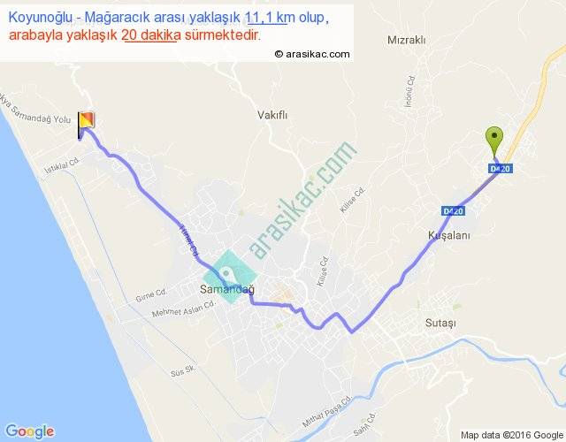 Koyunoğlu - Mağaracık arası yaklaşık olarak 90 km/h ile yukarıda belirtilen sürede olup, iki yerin kuş uçuşu uzaklığı (mesafesi) 7'dir. Yolculuk otobüsle 26 dakika sürmektedir.