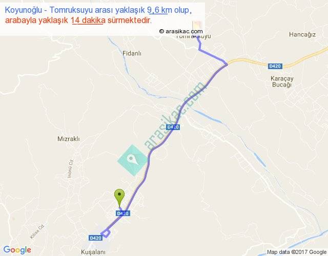 Koyunoğlu - Tomruksuyu arası yaklaşık olarak 90 km/h ile yukarıda belirtilen sürede olup, iki yerin kuş uçuşu uzaklığı (mesafesi) 6'dir. Yolculuk otobüsle 18 dakika sürmektedir.
