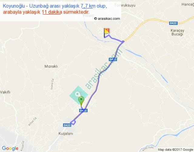 Koyunoğlu - Uzunbağ arası yaklaşık olarak 90 km/h ile yukarıda belirtilen sürede olup, iki yerin kuş uçuşu uzaklığı (mesafesi) 4'dir. Yolculuk otobüsle 14 dakika sürmektedir.