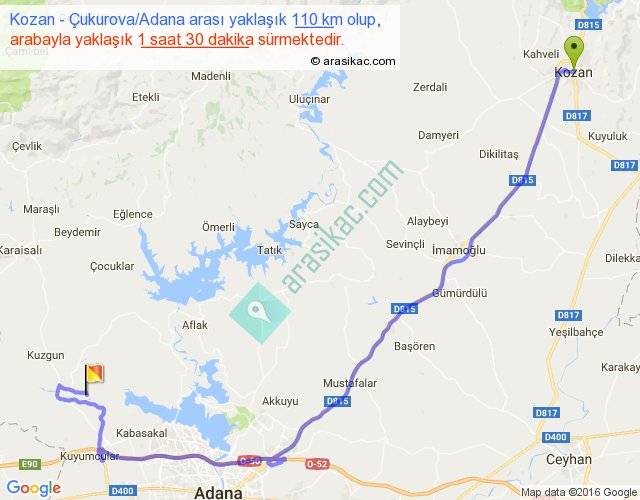 Kozan - Çukurova Adana arası yaklaşık olarak 90 km/h ile yukarıda belirtilen sürede olup, iki yerin kuş uçuşu uzaklığı (mesafesi) 71'dir. Yolculuk otobüsle 1 saat 57 dakika sürmektedir.
