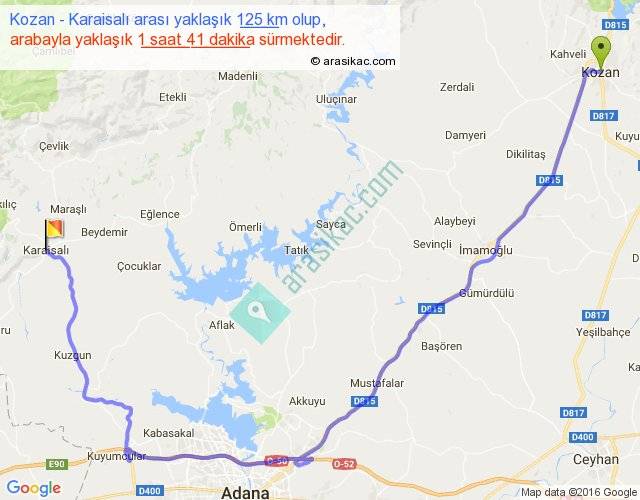 Kozan - Karaisalı arası yaklaşık olarak 90 km/h ile yukarıda belirtilen sürede olup, iki yerin kuş uçuşu uzaklığı (mesafesi) 70'dir. Yolculuk otobüsle 2 saat 11 dakika sürmektedir.