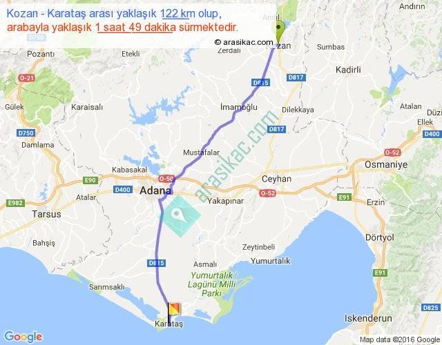 Kozan - Karataş arası yaklaşık olarak 90 km/h ile yukarıda belirtilen sürede olup, iki yerin kuş uçuşu uzaklığı (mesafesi) 105'dir. Yolculuk otobüsle 2 saat 21 dakika sürmektedir.