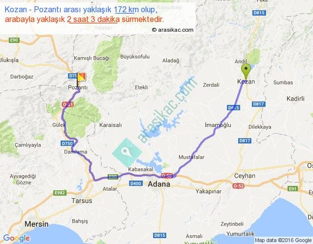 Kozan - Pozantı arası yaklaşık olarak 90 km/h ile yukarıda belirtilen sürede olup, iki yerin kuş uçuşu uzaklığı (mesafesi) 83'dir. Yolculuk otobüsle 2 saat 39 dakika sürmektedir.