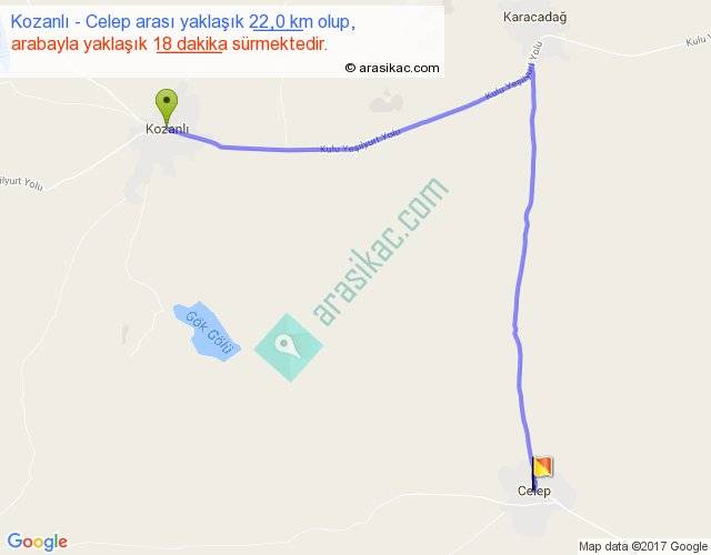 Kozanlı - Celep arası yaklaşık olarak 90 km/h ile yukarıda belirtilen sürede olup, iki yerin kuş uçuşu uzaklığı (mesafesi) 14'dir. Yolculuk otobüsle 23 dakika sürmektedir.
