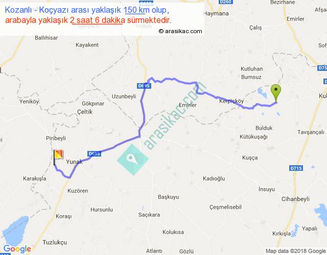 Kozanlı - Koçyazı arası yaklaşık olarak 90 km/h ile yukarıda belirtilen sürede olup, iki yerin kuş uçuşu uzaklığı (mesafesi) 106'dir. Yolculuk otobüsle 2 saat 43 dakika sürmektedir.