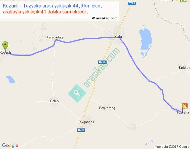 Kozanlı - Tuzyaka arası yaklaşık olarak 90 km/h ile yukarıda belirtilen sürede olup, iki yerin kuş uçuşu uzaklığı (mesafesi) 37'dir. Yolculuk otobüsle 53 dakika sürmektedir.