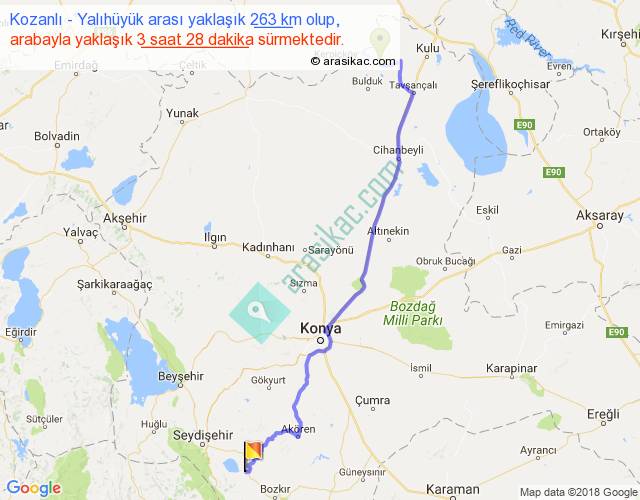 Kozanlı - Yalıhüyük arası yaklaşık olarak 90 km/h ile yukarıda belirtilen sürede olup, iki yerin kuş uçuşu uzaklığı (mesafesi) 205'dir. Yolculuk otobüsle 4 saat 30 dakika sürmektedir.