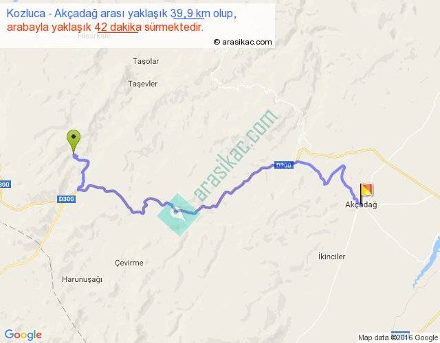 Kozluca - Akçadağ arası yaklaşık olarak 90 km/h ile yukarıda belirtilen sürede olup, iki yerin kuş uçuşu uzaklığı (mesafesi) 25'dir. Yolculuk otobüsle 54 dakika sürmektedir.