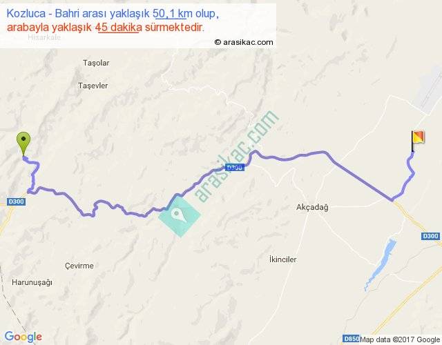 Kozluca - Bahri arası yaklaşık olarak 90 km/h ile yukarıda belirtilen sürede olup, iki yerin kuş uçuşu uzaklığı (mesafesi) 34'dir. Yolculuk otobüsle 58 dakika sürmektedir.