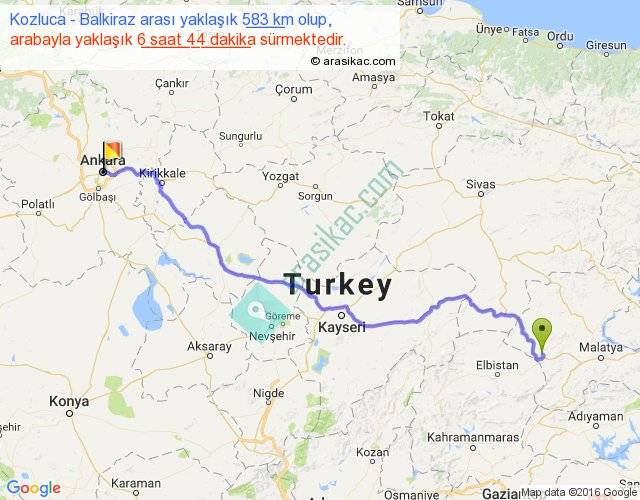Kozluca - Balkiraz arası yaklaşık olarak 90 km/h ile yukarıda belirtilen sürede olup, iki yerin kuş uçuşu uzaklığı (mesafesi) 445'dir. Eğer belirtilen yerler arasında uçak seferi var ise bu süre uçakla 41 dakika'ya kadar düşebilir. Yolculuk otobüsle 8 saat 45 dakika sürmektedir.